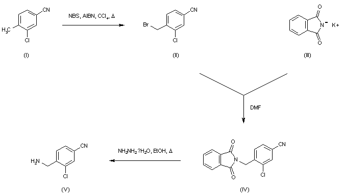 Benzylic bromination of 3-chloro-4-methylbenzonitrile (I) by means of N-bromosuccinimide and azobis(isobutyronitrile) provided bromide (II). Subsequent displacement of the bromine atom of (III) by potassium phthalimide (III) afforded the N-substituted phthalimide (IV), which was then deprotected with ethanolic hydrazine to furnish the primary amine (V).