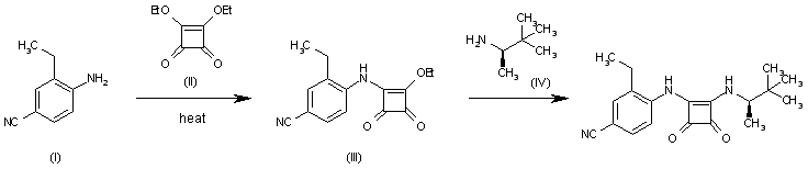 The condensation of 4-amino-3-ethylbenzonitrile (I) with 3,4-diethoxy-3-cyclobutene-1,2-dione (II) in refluxng acetonitrile gives 4-(2-ethoxy-3,4-dioxo-1-cyclobutenylamino)-3-ethylbenzonitrile (III), which is finally condensed with (R)-1,2,2-trimethylpropylamine (IV) in ethanol.