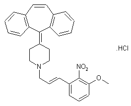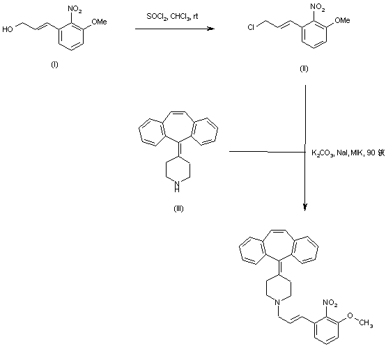 Treatment of 3-methoxy-2-nitrocinnamyl alcohol (I) with SOCl2 provided the corresponding chloride (II), which was then condensed with dibenzocycloheptylidenepiperidine (III) in the presence of K2CO3 and NaI in hot methyl isobutyl ketone to yield the title compound.
