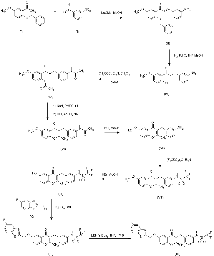 Aldol condensation of acetophenone (I) with 3-nitrobenzaldehyde (II) in the presence of sodium methoxide in methanol at room temperature afforded enone (III). Double bond hydrogenation over Pd/C in MeOH-THF, with simultaneous nitro group reduction and O-benzyl hydrogenolysis, provided hydroxy ketone (IV). This compound was acylated with acetyl chloride in the presence of triethylamine and catalytic dimethylaminopyridine(DMAP) to yield ester-amide (V), which was cyclized to chromenone (VI) on treatment with NaH in DMSO, followed by HCl in refluxing acetic acid (1). Acidic hydrolysis of amide (VI) gave amine (VII), and this was treated with triflic anhydride and triethylamine to afford the corresponding sulfonamide (VIII). Demethylation of ether (VIII) with HBr in acetic acid gave phenol (IX), and then alkylation with with 2-(chloromethyl)-5-fluorobenzothiazole (X) yielded (XI). Reduction of chromenone with L-Selectride(R) in THF at -78 C gave racemic chromanone (XII) with trans stereochemistry.