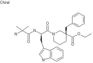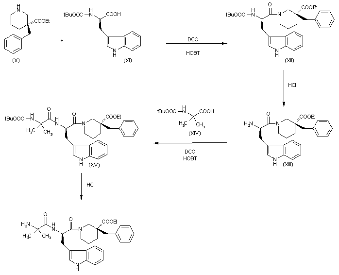 | 合成路线图解说明: The reaction of (X) with N-(tert-butoxycarbonyl)-D-tryptophan (XI) by means of DCC and HOBT in ethyl acetate affords the expected condensation product (XII), which is deprotected with HCl in hot ethanol giving compound (XIII) with its amino group free. The reaction of (XIII) with 2-(tert-butoxycarbonylamino)isobutyric acid (XIV) by means of DCC and HOBT as before yields the expected condensation product (XV), which is finally deprotected with HCl in methanol as before to give the target compound. |