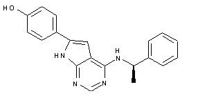 The cyclization of 4-methoxyphenacyl bromide (I) with 2-amidinoacetic acid ethyl ester (II) by means of sodium ethoxide in ethanol gives 2-amino-5-(4-methoxyphenyl)-1H-pyrrole-3-carboxylic acid ethyl ester (III), which is cyclized with formamide in DMF at 150 C to yield the pyrrolopyrimidine (IV). The reaction of the OH group of (IV) with POCl3 at 150 C affords the corresponding chloro derivative (V), which is condensed with 1(R)-phenylethylamine (VI) in refluxing butanol to provide the adduct (VII). Finally, this compound is demethylated by means of BBr3 in dichloromethane to furnish the target pyrrolopyrimidine.