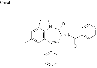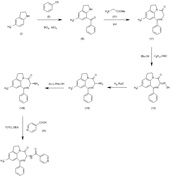 The condensation of 5-methylindoline (I) with benzonitrile (II) by means of BCl3 and AlCl3 in dichloroethane gives the 7-benzoyl-5-methylindoline (III), which is cyclized with glycine methyl ester (IV) in pyridine yielding the tricyclic pyrrolobenzodiazepinone (V). The reaction of (V) with isoamyl nitrite and potassium tert-butoxide in THF affords the oxime (VI), which is reduced with H2 over Ru/C in methanol providing the racemic amine (VII). The optical resolution of (VII) with N-acetyl-L-phenylalanine gives the desired isomer (VIII), which is finally condensed with pyridine-4-carboxylic acid (IX) by means of O-[1-(ethoxycarbonyl)-1-cyanomethyleneamino]-N,N,N',N'-tetramethyluronium tetrafluoroborate (TOTU) and DIEA in dichloromethane.