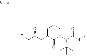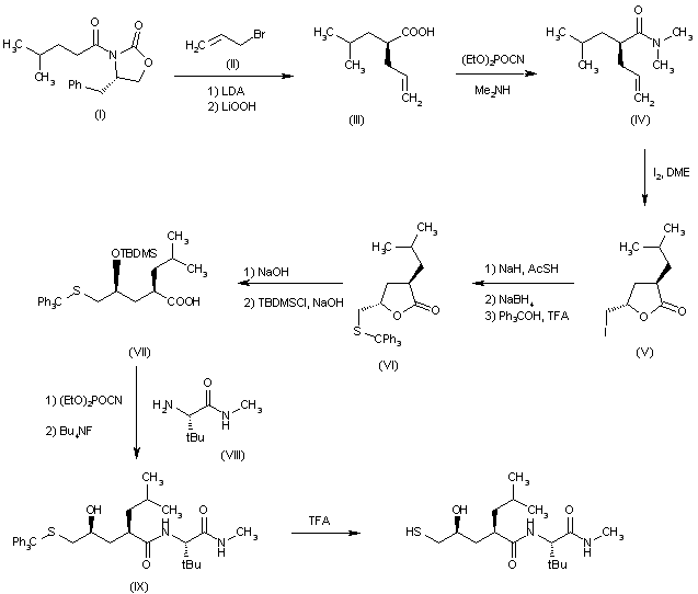 The alkylation of 4(S)-benzyl-3-(4-methylpentanoyl)oxazolidin-2-one (I) with allyl bromide (II) by means of lithium diisopro-pylamide (LDA), followed by hydrolysis with LiOOH gives the chiral pentenoic acid (III), which is iodinated with I2, KI, KHCO3 with simultaneous cyclization yielding (R,R)-5-(iodomethyl)-3-isobutyltetrahydrofuran-2-one (IV). The condensation of (IV) with thioacetic acid by means of NaH, followed by a reductive cleavage and tritylation with triphenylmethanol and trifluoroacetic acid gives (R,R)-3-isobutyl-5-(tritylsulfanylmethyl)tetrahydrofuran-2-one (V). The ring opening of (V) with NaOH, follwed by silylation with tert-butyldimethylsilyl chloride gives (R,R)-4-(tert-butyldimethylsilyloxy)-2-isobutyl-5-(tritylsulfanyl)pentanoic acid (VI), which is condensed with 2(S)-amino-N,3,3-trimethylbutyramide (VII) by means of cyanophosphonic acid diethyl ester and desilylated with tetrabutylammonium fluoride to yield 2(S)-[2(R)-isobutyl-4-(R)-hydroxy-5-(triphenylmethylsulfanyl)pen-tanamido]-N,3,3-trimethylbutyramide (VIII). Finally, this compound is detritylated with trifluoroacetic acid (TFA) to afford the target compound.