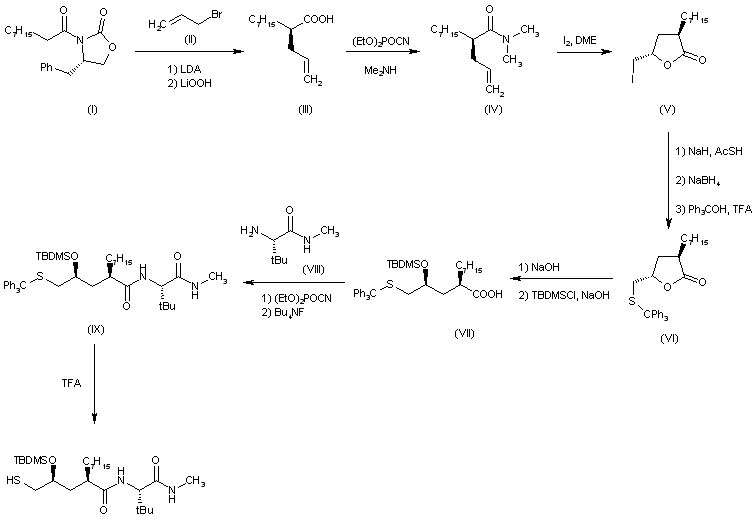 The alkylation of 4(S)-benzyl-3-nonanoyloxazolidin-2-one (I) with allyl bromide (II) by means of lithium diisopropylamide (LDA), followed by hydrolysis with LiOOH gives the chiral pentenoic acid (III), which is treated with dimethylamine and cyanophosphonic acid diethyl ester yielding the dimethylamide (IV). The iodination of (IV) with I2/dimethoxyethane (DME) with simultaneous cyclization yields 3(R)-heptyl-5(S)-(iodomethyl)tetrahydrofuran-2-one (V). The condensation of (V) with thioacetic acid by means of NaH, followed by a reductive cleavage and tritylation with triphenylmethanol and trifluoroacetic acid (TFA) affords 3(R)-heptyl-5(S)-(tritylsulfanylmethyl)tetrahydrofuran-2-one (VI). The ring opening of (VI) with NaOH, follwed by silylation with tert-butyldimethylsilyl chloride gives 4(S)-(tert-butyldimethyl-silyloxy)-2(R)-heptyl-5-(tritylsulfanyl)pentanoic acid (VII), which is condensed with 2(S)-amino-N,3,3-trimethylbutyramide (VIII) by means of cyanophosphonic acid diethyl ester and desilylated with tetrabutylammonium fluoride to yield 2(S)-[2(R)-heptyl-4-(S)-hydroxy-5-(tritylsulfanyl)pentanamido]-N,3,3-trimethylbutyramide (IX). Finally, this compound is detritylated with trifluoroacetic acid (TFA) to afford the target compound (X).