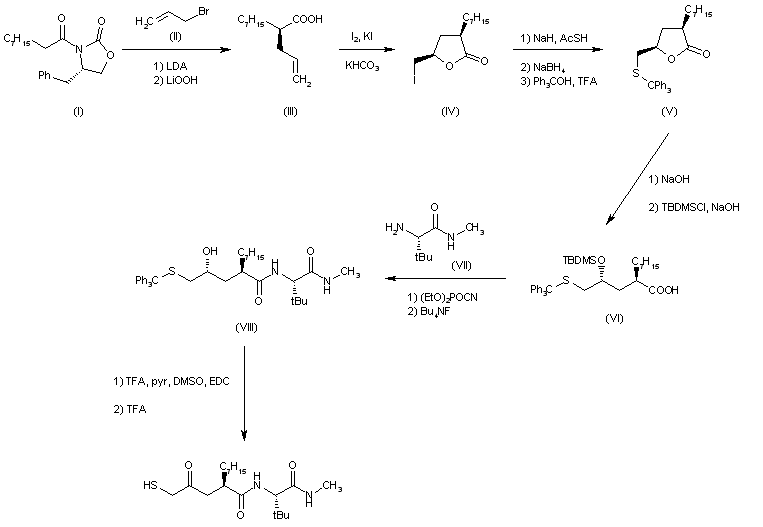 The alkylation of 4(S)-benzyl-3-nonanoyloxazolidin-2-one (I) with allyl bromide (II) by means of lithium diisopropylamide (LDA), followed by hydrolysis with LiOOH gives the chiral pentenoic acid (III), which is iodinated with I2, KI, KHCO3 with simultaneous cyclization yielding (R,R)-3-heptyl-5-(iodomethyl)tetrahydrofuran-2-one (IV). The condensation of (IV) with thioacetic acid by means of NaH, followed by a reductive cleavage and tritylation with triphenylmethanol and trifluoroacetic acid (TFA) affords (R,R)-3-heptyl-5-(triphenylmethyl-sulfanylmethyl)tetrahydrofuran-2-one (V). The ring opening of (V) with NaOH, follwed by silylation with tert-butyldimethylsilyl chloride gives (R,R)-4-(tert-butyldimethylsilyloxy)-2-heptyl-5-(tritylsulfanyl)pentanoic acid (VI), which is condensed with 2(S)-amino-N,3,3-trimethylbutyramide (VII) by means of cyanophosphonic acid diethyl ester and desilylated with tetrabutylammonium fluoride to yield 2(S)-[2(R)-heptyl-4(R)-hydroxy-5-(tritylsulfanyl)pentanamido]-N,3,3-trimethylbutyramide (VIII). Finally, compound (VIII) is oxidized with TFA, pyridine, DMSO and EDC, and detritylated with TFA to give the target compound.