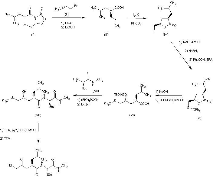 The alkylation of 4(S)-benzyl-3-(4-methylpentanoyl)oxazolidin-2-one (I) with allyl bromide (II) by means of lithium diisopro-pylamide (LDA), followed by hydrolysis with LiOOH gives the chiral pentenoic acid (III), which is iodinated with I2, KI, KHCO3 with simultaneous cyclization yielding (R,R)-5-(iodomethyl)-3-isobutyltetrahydrofuran-2-one (IV). The condensation of (IV) with thioacetic acid by means of NaH, followed by a reductive cleavage and tritylation with triphenylmethanol and trifluoroacetic acid gives (R,R)-3-isobutyl-5-(tritylsulfanylmethyl)tetrahydrofuran-2-one (V). The ring opening of (V) with NaOH, follwed by silylation with tert-butyldimethylsilyl chloride gives (R,R)-4-(tert-butyldimethylsilyloxy)-2-isobutyl-5-(tritylsulfanyl)pentanoic acid (VI), which is condensed with 2(S)-amino-N,3,3-trimethylbutyramide (VII) by means of cyanophosphonic acid diethyl ester and desilylated with tetrabutylammonium fluoride to yield 2(S)-[2(R)-isobutyl-4-(R)-hydroxy-5-(triphenylmethylsulfanyl)pen-tanamido]-N,3,3-trimethylbutyramide (VIII). Finally, compound (VIII) is oxidized with TFA, pyridine, DMSO and EDC, and detritylated with TFA to give the target compound.