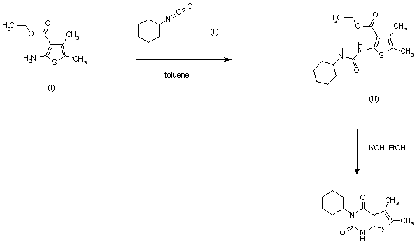 Condensation of aminothiophene (I) with cyclohexyl isocyanate (II) in refluxing toluene afforded urea (III). Then, treatment with ethanolic KOH gave the pyrimidine dione system.