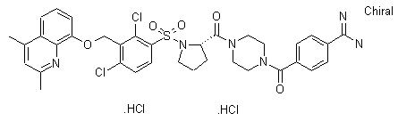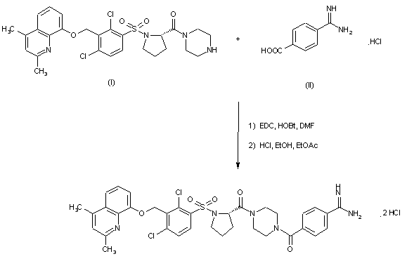 Title compound was obtained by coupling the sulfonylprolylpiperazine derivative (I) with 4-amidinobenzoic acid (II) in the presence of EDC and HOBt in DMF, followed by conversion to the dihydrochloride salt.