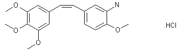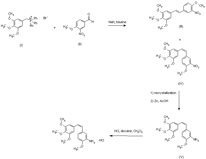 Wittig reaction of 3,4,5-trimethoxybenzyl phosphonium bromide (I) with benzaldehyde (II) in the presence of NaH in toluene yielded a 1:1 mixture of E (III) and Z (IV) stilbenes, from which the Z isomer was separated by crystallization from EtOAc and then from EtOH. Then, nitro group of (IV) was reduced with Zn in AcOH at room temperature to give anilino compound (V), which was converted to the hydrochloride salt with HCl in dioxane-methylene chloride.