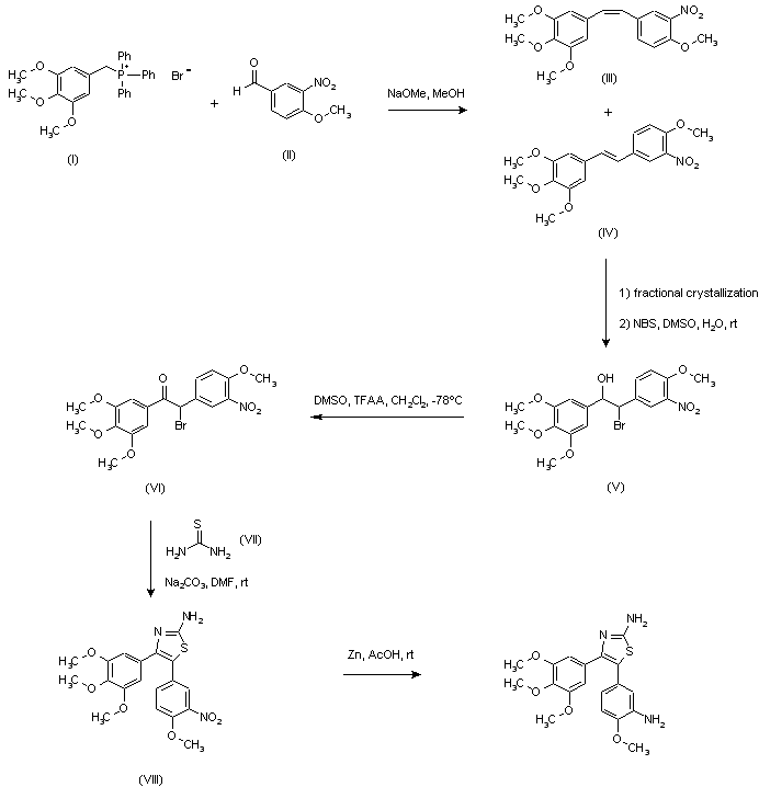 Wittig reaction of phosphonium bromide (I) with 4-methoxy-3-nitrobenzaldehyde (II) in the presence of NaOMe provided an approximately equimolecular mixture of Z- and E-stilbenes (III) and (IV), from which the E-isomer was isolated by crystallization. Stilbene (IV) was converted to bromohydrin (V) by treatment with N-bromosuccinimide in aqueous DMSO. Further Swern oxidation of (V) with DMSO-trifluoroacetic anhydride (TFAA) yielded bromoketone (VI), which was then cyclized with thiourea (VII) in the presence of K2CO3 in DMF to give aminothiazole (VIII). Finally, the nitro of (VIII) group was reduced to the target amine by treatment with Zn in AcOH.