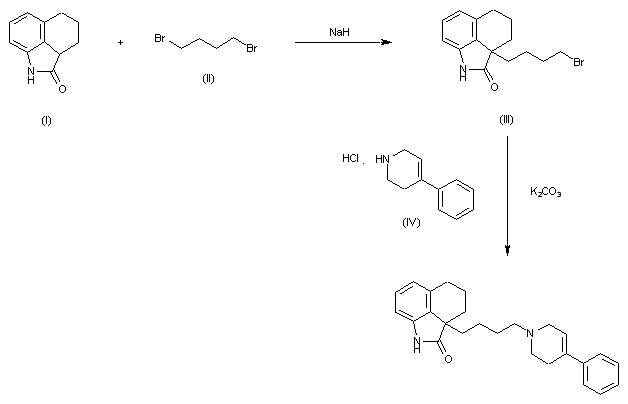 Tetrahydrobenzindole (I) was alkylated with 1,4-dibromobutane (II) in the presence of NaH to afford the bromobutyl derivative (III). This was then condensed with 4-phenyltetrahydropyridine (IV) to yield the title compound.