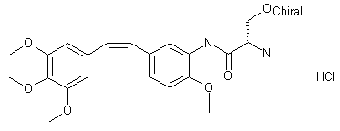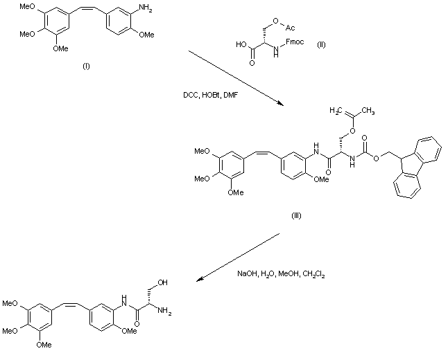 Coupling of (Z)-1-(3-amino-4-methoxyphenyl)-2-(3,4,5-trimethoxyphenyl)- ethene (I) with N-Fmoc-O-acetyl-L-serine (II) in the presence of DCC and HOBt provided the corresponding serineamide (III). Further deprotection of Fmoc and acetyl groups with NaOH furnished the title compound.