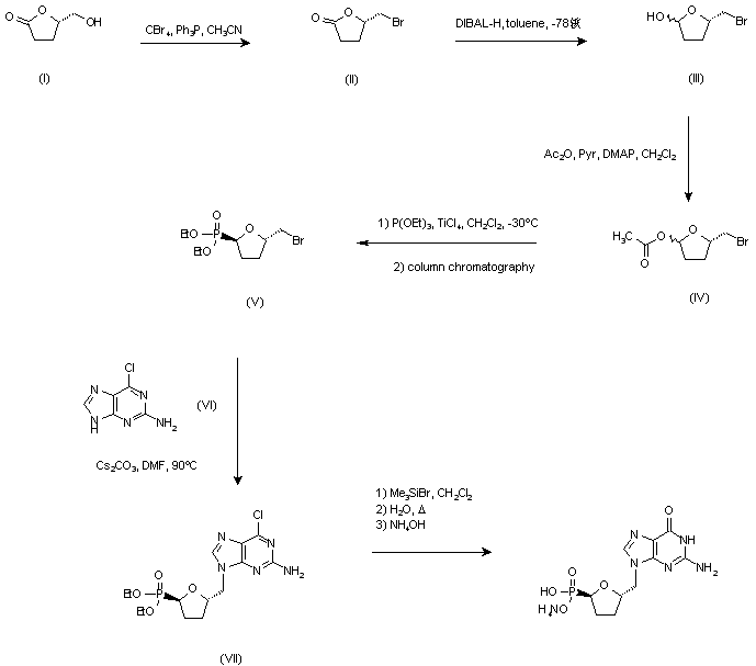 (S)-5-(Hydroxymethyl)tetrahydrofuran-2-one (I) was converted into bromide (II) by reaction with CBr4 and PPh3. Subsequent reduction of the lactone with DIBAL-H in toluene at -78 C, followed by acetylation of the resulting lactol (III) with Ac2O and pyridine, afforded acetate (IV) as a 1:1 mixture of isomers cis and trans. The phosphonate group was then introduced by a TiCl4-catalyzed Arbuzov reaction with triethyl phosphite at low temperature, to give a mixture of geometric isomers, from which the desired cis compound (V) was isolated by column chromatography. Condensation of this bromide with 2-amino-6-chloropurine (VI) in the presence of Cs2CO3 in DMF gave (VII). The phosphonate ester was hydrolyzed by treatment with excess Me3SiBr to produce an intermediate trimethylsilyl ester, and then the target compound was obtained by simultaneous hydrolysis of the silyl ester to phosphonic acid and the 6-chloropurine group to guanine in boiling water, followed by conversion to the corresponding ammonium salt with NH4OH.