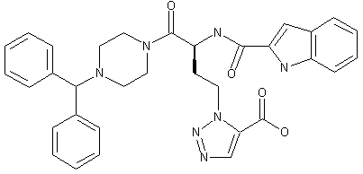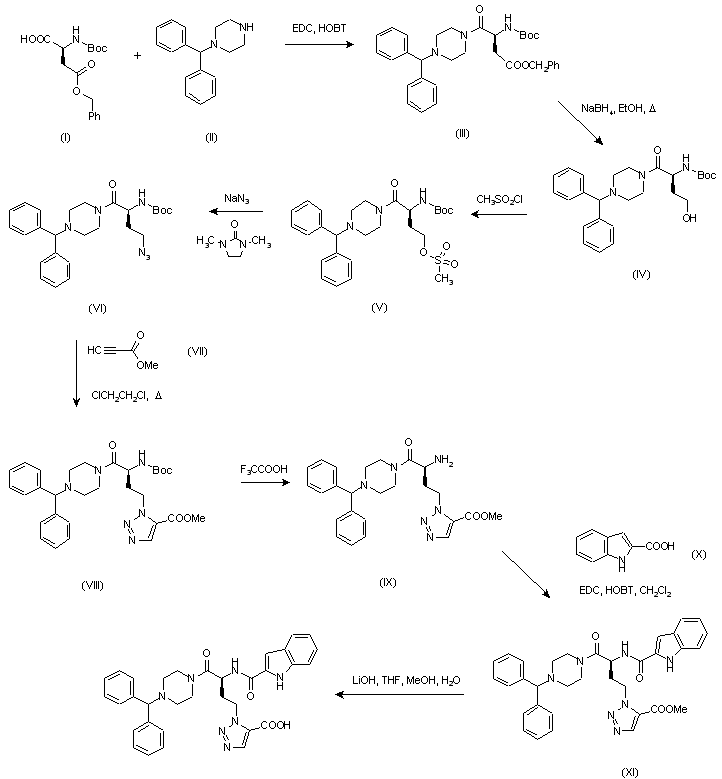 Condensation of N-Boc-L-aspartic acid gamma-benzyl ester (I) with N-benzhydryl piperazine (II) using 1-ethyl-3-(3-dimethylaminopropyl)- carbodiimide hydrochloride (EDC) and 1-hydroxybenzotriazole (HOBT) as the condensig agents gave amide (III). Reduction of the ester group of (III) with NaBH4 in refluxing EtOH provided alcohol (IV), which was treated with methanesulfonyl chloride to afford mesylate (V). Subsequent reaction of (V) with sodium azide in N,N'-dimethylimidazolidinone gave azide (VI), and further cycloaddition of this azide with methyl propiolate (VII) in refluxing dichloroethane furnished triazole (VIII). The tert-butoxycarbonyl protecting group of (VIII) was then removed by treatment with trifluoroacetic acid at room temperature to yield amine (IX), which was condensed with indole-2-carboxylic acid (X) in the presence of EDC and HOBT to give amide (XI). Finally, hydrolysis of (XI) with LiOH provided the target carboxylic acid.
