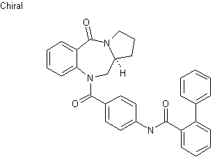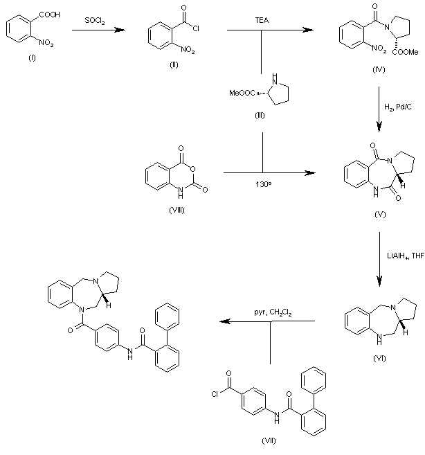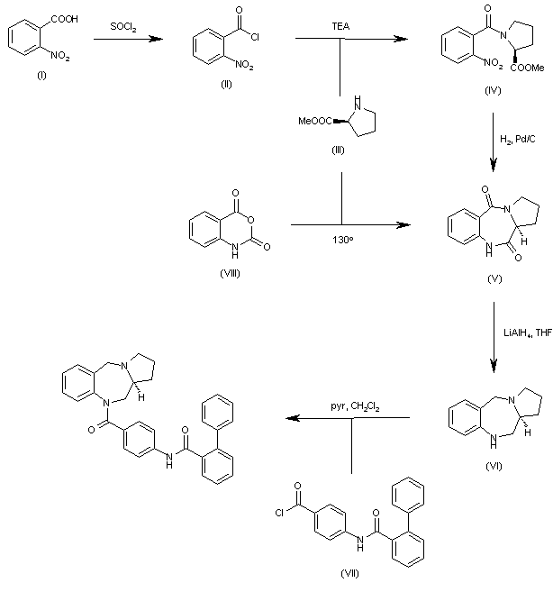 The reaction of 2-nitrobenzoic acid with SOCl2 gives the acyl chloride (II), which is condensed with D-proline (III) by means of TEA in dichloromethane yielding the acyl proline (IV). The reductive cyclization of (IV) with H2 over Pd/C in methanol affords the pyrrolobenzodiazepinedione (V). The selective reduction of the C-11 lactam group of (V) with NaBH4 and TFA in glyme gave the pyrrolobenzodiazepinone (VI), which is finally coupled with 4-[(2-phenylbenzoyl)amino]benzoyl chloride (VII) furnishing the title compound.