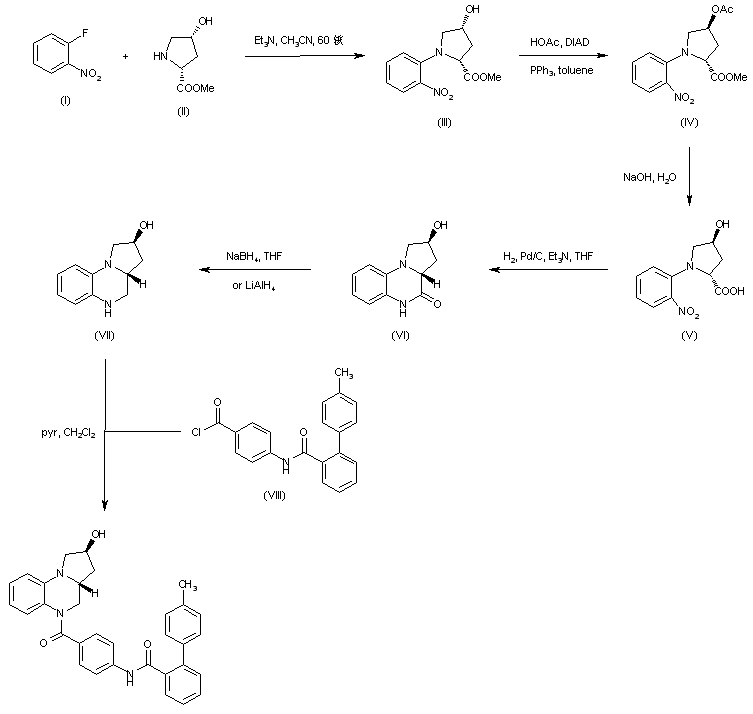Condensation of 1-fluoro-2-nitrobenzene (I) with cis-4-hydroxy-D-proline methyl ester (II) in hot acetonitrile provided the N-(2-nitrophenyl)proline derivative (III). The stereochemical inversion of the hydroxyl group of (III) was achieved by Mitsunobu coupling with acetic acid, followed by basic hydrolysis of the resulting acetate ester (IV) to acid (V). The nitro acid (V) obtained was then hydrogenated over Pd/C to form the tricyclic lactam (VI). Further reduction of the lactam carbonyl group by means of NaBH4 in refluxing THF gave pyrroloquinoxaline (VII). This was finally coupled with 4-(4'-methyl-2-biphenylcarboxamido)benzoyl chloride (VIII) to furnish the target amide.