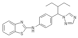 In a different procedure, N-(4-bromophenyl)-2-benzothiazolamine (XI) was converted into the lithio derivative and subsequently condensed with 2-ethylbutanal (XII) to give carbinol (XIII). Treatment of (XIII) with methanesulfonyl chloride and triethylamine provided mesylate (XIV), which was finally displaced by 1,2,4-triazole (V), yielding the title compound.