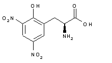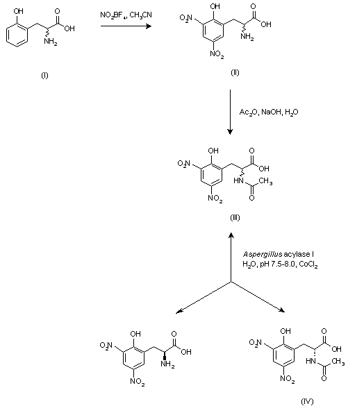 Nitration of 2-hydroxy-DL-phenylalanine (I) with nitronium tetrafluoroborate in cooled acetonitrile provided the dinitro compound (II), which was isolated through a cation exchange column as the ammonium phenolate salt. Acylation under Schotten Baumann conditions gave racemic acetamide (III). Then, kinetic resolution with Aspergillus acylase I produced the desired (S)-amine together with unaltered (R)-acetamide (IV), which were separated by partition between water and ethyl acetate. The organic extract provided (S)-amine with an optical purity of > 99% e.e.