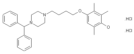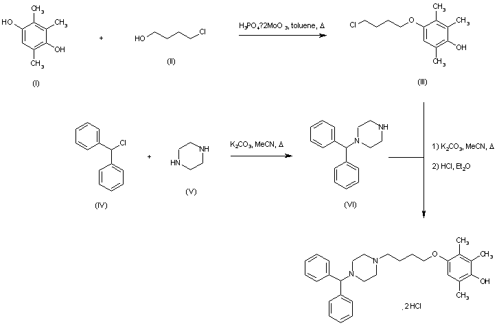 Condensation of trimethylhydroquinone (I) with 4-chloro-1-butanol (II) in the presence of phosphomolybdic acid in refluxing toluene yielded the chlorobutyl ether (III). Benzhydrylpiperazine (VI), (prepared from chlorodiphenylmethane (IV) and piperazine (V)), was then condensed with chloride (III) to give the target compound, which was isolated as the dihydrochloride salt.