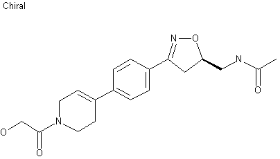 The asymmetric 1,3-dipolar cycloaddition of the nitrile oxide resulting from 4-bromo-N-hydroxybenzenecarboximidoyl chloride (I) to allyl alcohol (II) in the presence of (R,R)-diisopropyl tartrate and diethylzinc afforded the (R)-5-(hydroxymethyl)isoxazoline (III). After conversion of (III) to the mesylate (IV), treatment with ammonium hydroxide in a sealed vessel provided primary amine (V), which was then acetylated with Ac2O and pyridine to give amide (VI). Further treatment of (VI) with hexamethylditin and dichlorobis(triphenylphosphine) palladium yielded the trimethylstannyl derivative (VII). Reaction of N-Boc-4-piperidone (VIII) with lithium diisopropylamide and N-phenyl-trifluoromethanesulfonimide at low temperature furnished the corresponding vinyl triflate (IX). Subsequent coupling of (IX) with stannyl derivative (VII) in the presence of tris(dibenzylideneacetone)dipalladium and triphenylarsine gave rise to the N-Boc-tetrahydropyridylphenylisoxazole (X). The Boc group of (X) was then deprotected using trifluoroacetic acid, and the deprotected tetrahydropyridine (XI) was condensed with acetoxyacetyl chloride (XII), yielding the acetoxyacetamide (XIII). The acetate ester of (XIII) was finally hydrolyzed by means of K2CO3 in MeOH.