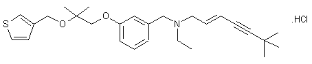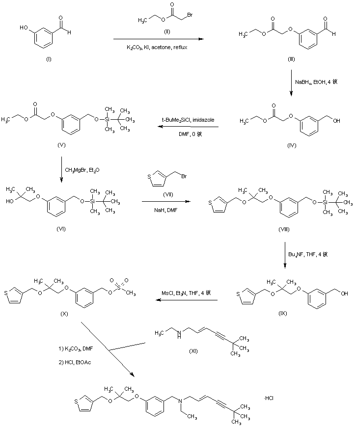 Ethyl 2-(3-formylphenoxy)acetate (III) was prepared by alkylation of 3-hydroxybenzaldehyde (I) with ethyl bromoacetate (II) in the presence of K2CO3 and KI. Reduction of aldehyde (III) with NaBH4 provided the benzyl alcohol (IV), which was further protected as the silyl ether (V) by treatment with tert-butyldimethylsilyl chloride and imidazole. Addition of methylmagnesium bromide to the ester function of (V) yielded the tertiary alcohol (VI). Condensation of the sodium alkoxide of (VI) with 3-(bromomethyl)thiophene (VII) furnished ether (VIII). After desilylation of (VIII) employing tetrabutylammonium fluoride, the resultant benzyl alcohol (IX) was treated with methanesulfonyl chloride and triethylamine to afford mesylate (X). Alkylation of amine (XI) with mesylate (X) furnished the target tertiary amine, which was finally treated with HCl in EtOAc to afford the corresponding hydrochloride salt.