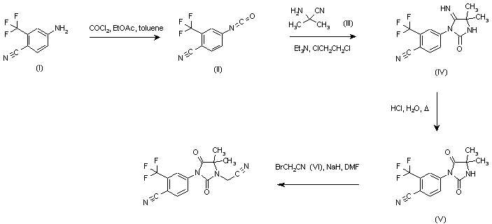 The reaction of 4-cyano-3-(trifluoromethyl)aniline (I) with phosgene afforded isocyanate (II). Subsequent condensation with 2-amino-2-methylpropionitrile (III) in the presence of Et3N in dichloroethane yielded the iminoimidazolidinone (IV), which was hydrolyzed to hydantoin (V) with refluxing 0.5 M HCl. Finally, alkylation with bromoacetonitrile (VI) in the presence of NaH in DMF provided the cyanomethyl compound.