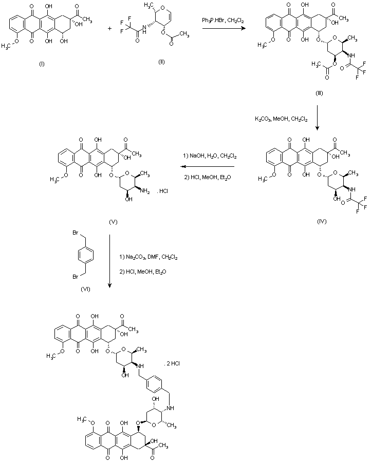 Condensation of daunomycinone (I) with aminoglycal (II) in the presence of triphenylphosphine hydrobromide provided the protected hexopyranosyl daunomycinone (III). Deacetylation with K2CO3 in MeOH-CH2Cl2 gave alcohol (IV), and further hydrolysis of the trifluoroacetamide with NaOH yielded amine (V), which was isolated as the hydrochloride. Finally, condensation of two molecules of (V) with a,a'-dibromo-p-xylene (VI) in the presence of Na2CO3 in DMF-CH2Cl2 at room temperature, followed by precipitation of the dihydrochloride from MeOH-Et2O, provided the target compound.