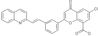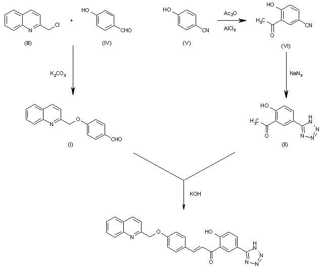 By condensation of 4-(2-quinolinylmethoxy)benzaldeyde (I) with 2-hydroxy-5(1H-tetrazol-5-yl)acetophenone (II) by means of KOH in ethanol/water. The intermediates (I) and (II) have been obtained as follows: Benzaldehyde (I): By condensation of 2-(chloromethyl)quinoline (III) with 4-hydroxybenzaldehyde (IV) by means of K2CO3 in hot DMF. Acetophenone (II): The acetylation of 4-hydroxybenzonitrile (V) with acetic anhydride/sulfuric acid and AlCl3 gives 5-cyano-2-hydroxyacetophenone (VI), which is then cyclized with sodium azide and ammonium chloride in hot DMF.
