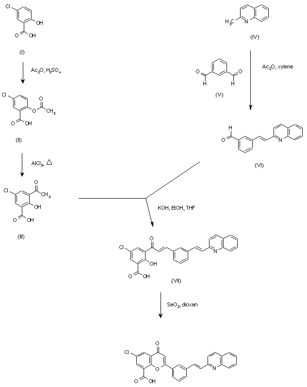 The intermediate acetophenone (III) was prepared from 5-chlorosalicylic acid (I) by O-acetylation with acetic anhydride and a catalytic amount of sulfuric acid, followed by Fries rearrangement of the resulting acetate (II) on heating with aluminum chloride. Condensation of 2-methylquinoline (IV) with an excess of 1,3-benzene dicarboxaldehyde (V) in a refluxing mixture of acetic anhydride and xylene provided aldehyde (VI), which was then condensed with acetophenone (III) by treatment with KOH in a mixture of ethanol and tetrahydrofuran to give chalcone (VII). Finally, oxidative ring closure by refluxing with selenium dioxide in dioxan yielded the desired flavone.