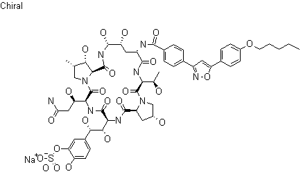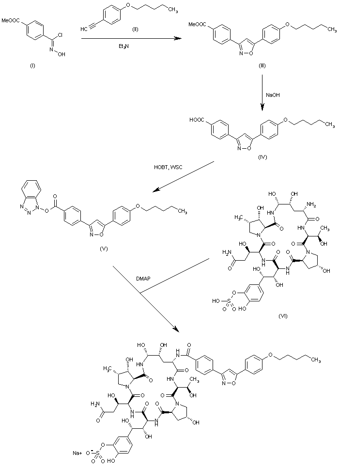 The synthesis of FK-463 can be performed as follows: The enzymatic deacylation of FR-901379 with Streptomyces anulatas No. 4811, S. anulatas No. 8703, Streptomyces strain No. 6907 or A. utahensis IFO13244 gives the deacylated lipopeptide FR-179642 (1), which is then reacylated with 1-[4-[5-(4-pentyloxyphenyl)isoxazol-3-yl]benzoyl]benzotriazole 3-oxide (VI) by means of dimethylaminopyridine (DMAP) in DMF. The acylating compound (VI) can be obtained as follows: The cyclization of 4-pentyloxyphenylacetylene (I) with 4-(hydroxyiminomethyl)benzoic acid methyl ester (II) by means of triethylamine in hot THF gives 4-[5-(4-pentyloxyphenyl)isoxazol-3-yl]benzoic acid methyl ester (III), which is hydrolyzed with NaOH in hot THF/water yielding the corresponding free acid (IV). Finally, this compound is condensed with 1-hydroxybenzotriazole (V) by means of 1-ethyl-3-[3-(dimethylamino)propyl]carbodiimide (EDMCA) in dichloromethane.