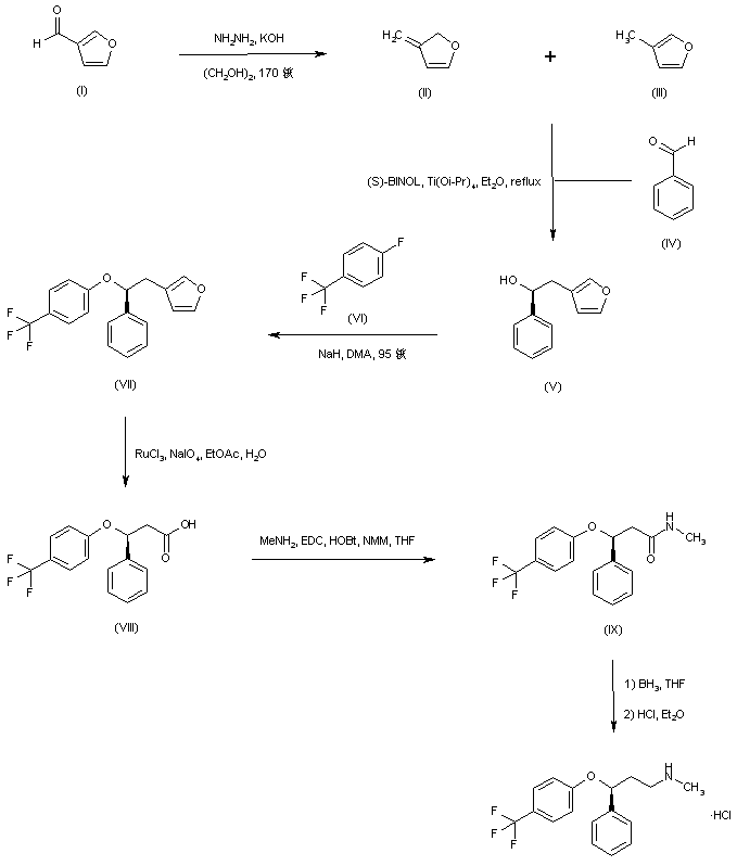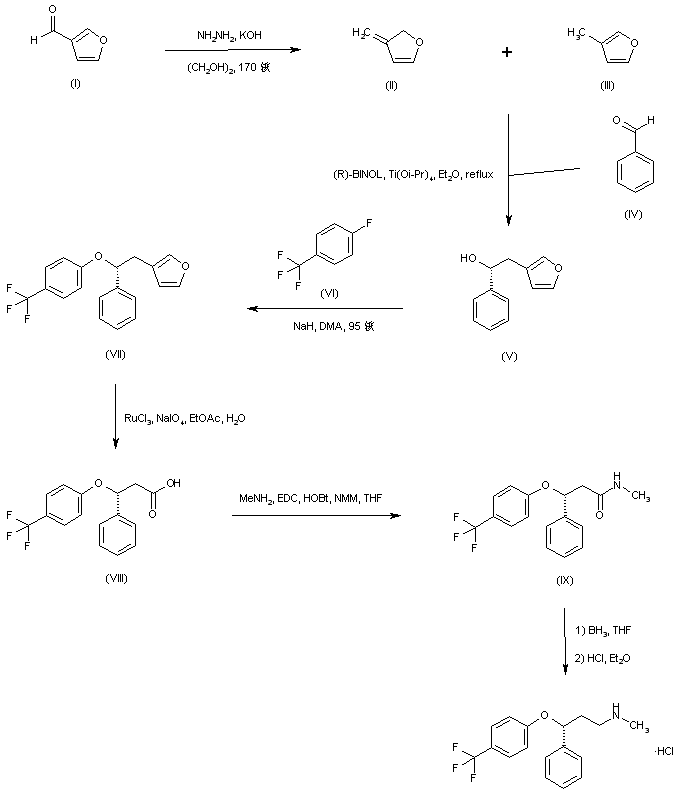 Reduction of 3-furaldehyde (I) under Wolff-Kishner conditions provided the desired 3-methylene-2,3-dihydrofuran (II) along with minor amounts of 3-methylfuran (III), which were used in the next step without previous separation. The asymmetric carbonyl-ene reaction of (II) with benzaldehyde (IV) using (R)-1,1'-binaphthol and titanium isopropoxide furnished the target (R)-2-(3-furyl)-1-phenylethanol (V). Condensation of the sodium alkoxide of (V) with 4-fluorobenzotrifluoride (VI) gave rise to ether (VII). Carboxylic acid (VIII) was then obtained by oxidative cleavage of the furan derivative (VII) with RuCl3/NaIO4. Coupling of acid (VIII) with methylamine gave amide (IX). Finally, amide reduction employing borane in THF yielded the title compound.