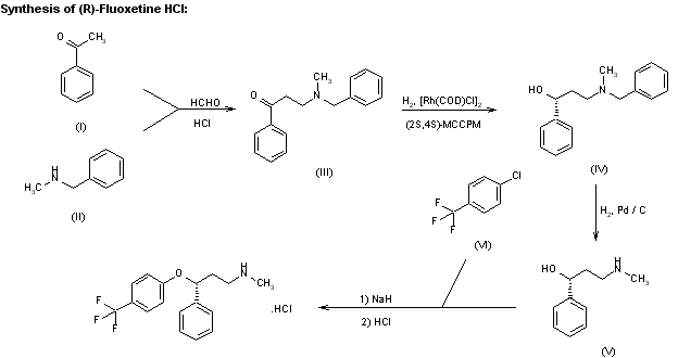 The synthesis of (R)-fluoxetine hydrochloride has been described: The condensation of acetophenone (I) with N-benzyl-N-methylamine (II) and formaldehyde by means of concentrated HCl in refluxing methanol gives 3-(N-benzyl-N-methylamino)propiophenone (III), which is asymmetrically reduced with H2 at 30 Atm. over [Rh(1,5-cyclooctadiene)Cl] and the chiral phosphine (2S,4S)-1-(N-methylcarbamoyl)-4-(dicyclohexylphosphino)-2-(diphenylphos phinomethyl)pyrrolidine in methanol yielding (R)-3-(N-benzyl-N-methylamino)-1-phenyl-1-propanol (IV). The debenzylation of (IV) with H2 over Pd/C in ethanol affords (R)-3-(methylamino)-1-phenyl-1-propanol (V), which is finally condensed with 1-chloro-4-(trifluoromethyl)benzene (VI) by means of NaH in dimethylacetamide.