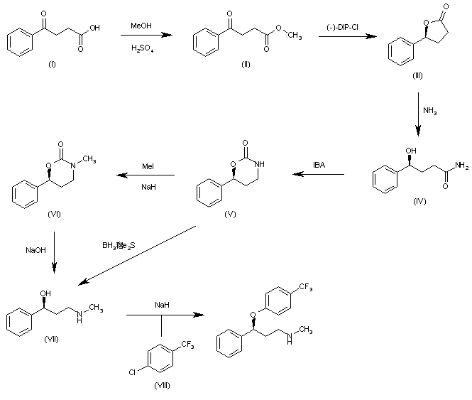 The esterification of 3-benzoylpropionic acid (I) with methanol and sulfuric acid gives the corresponding methyl ester (II), which is regioselectively reduced with (-)-B-chlorodiisopinocampheylborane [(-)-DIP-Cl] in THF, yielding the chiral lactone (III). Ring opening of (III) with ammonia in methanol affords the chiral butyramide (IV), which is treated with iodobenzene diacetate (IBA) in acetonitrile to provide the cyclic carbamate (V). The methylation of (V) with NaH and methyl iodide in DMF gives the expected N-methyl derivative (VI), which is hydrolyzed with NaOH in refluxing ethanol to yield the chiral 3-(methylamino)-1(S)-phenyl-1-propanol (VII). Finally, this compound is condensed with 4-(trifluoromethyl)chlorobenzene (VIII) by means of NaH in DMSO. The intermediate propanol (VII) can also be obtained directly from (V), by reductive cleavage of the carbamate ring with borane/dimethyl sulfide complex in THF.