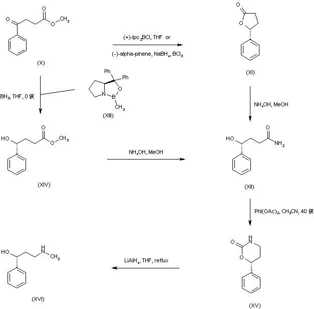 The chiral precursor (R)-3-(methylamino)-1-phenyl-1-propanol (XVI) has been prepared by an alternative method. Asymmetric reduction of methyl 3-benzoylpropionate (X) to produce the (R)-lactone (XI) was performed either employing commercial (+)-B-chlorodiisopinocampheylborane or generating in situ this reagent from alpha-pinene, NaBH4 and BCl3. Ammonolysis of lactone (XI) in MeOH afforded hydroxy amide (XII). This chiral intermediate (XII) was alternatively obtained by reduction of keto ester (X) with borane in the presence of the oxaazaborolidine chiral auxiliary (XIII) to produce the (R)-hydroxy ester (XIV), which was subsequently treated with ammonium hydroxyde in MeOH. Hofmann rearrangement of amide (XII) using iodobenzene diacetate led to the cyclic carbamate (XV). The key amino alcohol precursor (XVI) was then obtained by reduction of carbamate (XV) with LiAlH4.