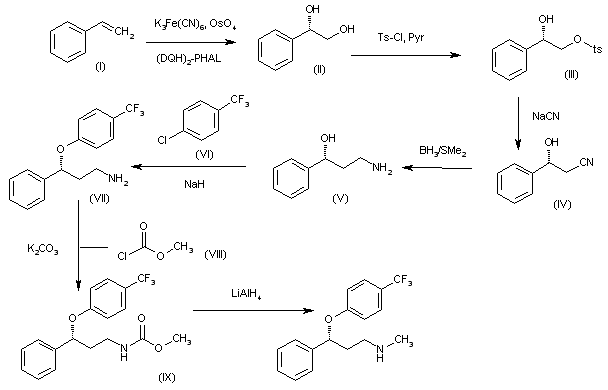 The asymmetric dihydroxylation of styrene (I) by means of K3Fe(CN)6 and OsO4, catalyzed by 1,4-bis(dihydroquinin-9-O-yl)phthalazine ((DHQ)2PHAL)in tert-butanol/water gives the 1(R)-phenylethane-1,2-diol (II), which is treated with Ts-Cl and pyridine in dichloromethane to yield the monotosylate (III). The reaction of (III) with NaCN in Et-OH/water affords 3(R)-hydroxy-3-phenylpropionitrile (IV), which is reduced by means of BH3/Me2S in refluxing THF to provide the corresponding amine (V). The O-alkylation of (V) with 4-(trifluoromethyl)chlorobenzene (VI) by means of NaH in hot DMSO gives 3(R)-phenyl-3-[4(trifluoromethyl)phenoxy]propylamine (VII), which is treated with methyl chloroformate (VIII) and K2CO3 in dichloromethane to yield the carbamate (IX) Finally, this compound is reduced by means of LiAlH4 in THF to provide the target (R)-fluoxetine.