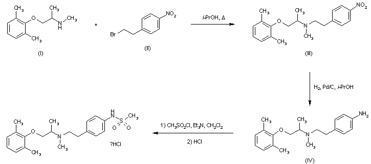 Amine (I) was alkylated with 4-nitrophenethyl bromide (II) in refluxing isopropanol to yield the tertiary amine (III). Hydrogenation of the nitro group of (III) employing Pd/C afforded aniline (IV). Subsequent condensation of (IV) with methanesulfonyl chloride in the presence of Et3N produced the corresponding sulfonamide. The title compound was finally isolated as the hydrochloride salt.