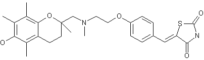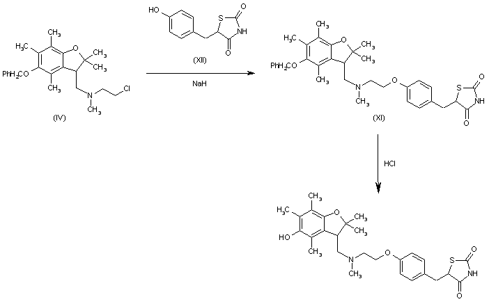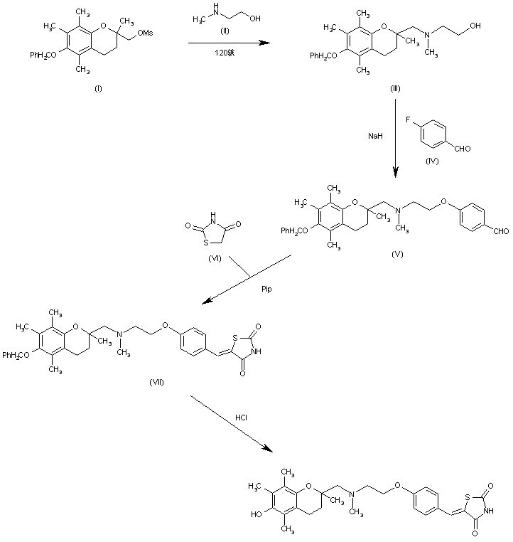 A new synthesis of the title compound, very similar to that already published, is reported: The condensation of 6-(benzyloxy)-2,5,7,8-tetramethyl-3,4-dihydro-2H-1-benzopyran-2-ylmethyl methanesulfonate (I) with 2-(methylamino)ethanol (II) by heating at 120 C gives the tertiary amine (III), which is condensed with 4-fluorobenzaldehyde (IV) by means of NaH in DMF yielding the 4-alkoxy benzaldehyde (V). A new condensation of (V) with thiazolidine-2,4-dione (VI) by means of piperidine in refluxing toluene affords the benzyloxy derivative of the target compound (VII). Finally, the target compound is obtained by treatment of (VII) with HCl in acetic acid.