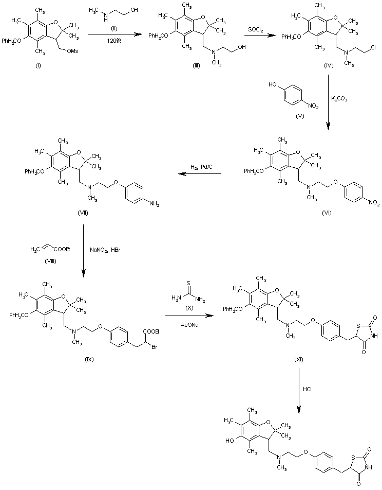 The condensation of 5-(benzyloxy)-2,2,4,6,7-pentamethyl-3,4-dihydrobenzofuran-3-ylmethyl methanesulfonate (I) with 2-(methylamino)ethanol (II) by heating at 120 C gives the tertiary amine (III), which is treated with SOCl2 in benzene yielding the chloroethylamino compound (IV). The condensation of (IV) with 4-nitrophenol (V) by means of K2CO3 in hot DMF affords the 4-nitrophenoxy compound (VI), which is reduced with H2 over Pd/C in ethyl acetate to the corresponding 4-aminophenoxy compound (VII). The condensation of (VII) with ethyl acrylate (VIII) by means of NaNO2 and HBr in methanol/water gives the 2-bromopropionic ester (IX), which is cyclized with thiourea (X) by means of NaOAc in refluxing ethanol yielding the thiazolidinedione (XI). Finally, this compound is debenzylated with HCl in hot acetic acid.