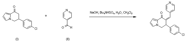 Title compound was prepared by condensation of tetrahydroindolizinone (I) with pyridine-4-carboxyaldehyde (II) under phase transfer conditions using NaOH and tetrabutyl hydrogensulfate in a mixture of H2O and CH2Cl2.