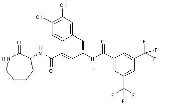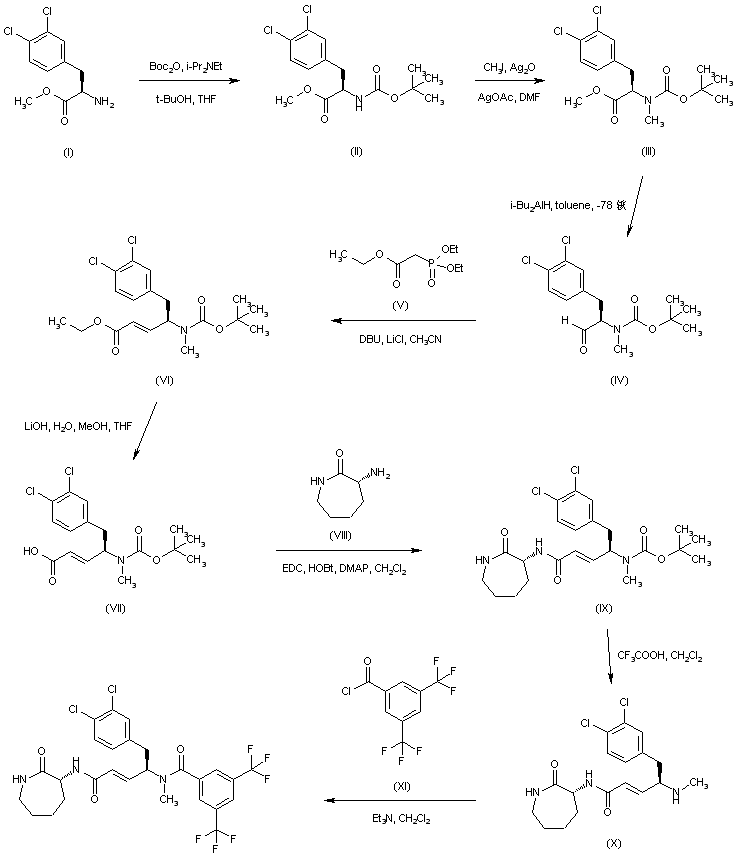 (3,4-Dichlorophenyl)alanine methyl ester (I) was converted to the N-Boc amino ester (II), which was subsequently alkylated with iodomethane in the presence of Ag2O, yielding the N-methyl derivative (III). Partial reduction of the ester group of (III) to the aldehyde (IV) was carried out using DIBAL in toluene at -78 C. Horner-Emmons reaction of aldehyde (IV) with triethyl phosphonoacetate (V) furnished the arylpentenoate ester (VI), which was further hydrolyzed to acid (VII) with LiOH. Coupling of acid (VII) with D-3-amino-epsilon-caprolactam (VIII) gave rise to amide (IX). The N-Boc group of (IX) was removed by treatment with trifluoroacetic acid, and the resulting amine (X) was finally acylated with 3,5-bis(trifluoromethyl)benzoyl chloride to produce the target amide.
