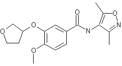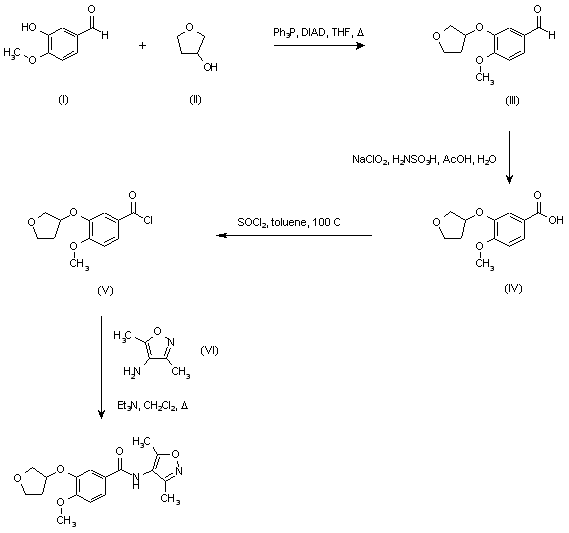 Coupling of isovanillin (I) with 3-hydroxytetrahyrofuran (II) in the presence of triphenyl phosphine and diisopropyl azodicarboxylate yielded the tetrahydrofuryl ether (III). Subsequent oxidation of the aldehyde using sodium chlorite and sulfamic acid gave carboxylic acid (IV), which was further converted to acid chloride (V) upon treatment with SOCl2 in toluene. Finally, condensation of (V) with 4-amino-3,5-dimethylisoxazole (VI) provided the title compound.