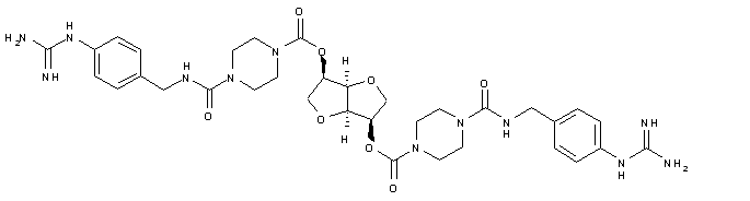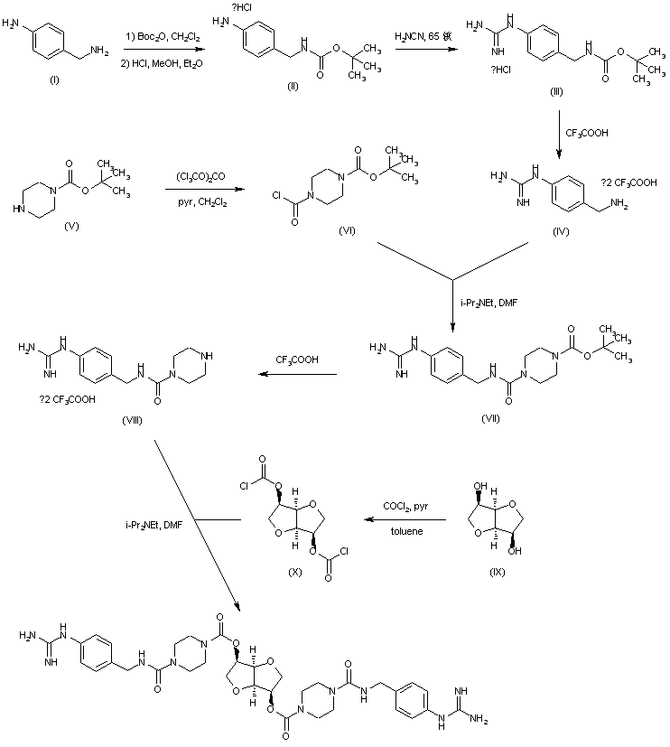 4-Aminobenzylamine (I) was protected as the tert-butyl carbamate (II) upon treatment with Boc2O. Heating of (II) with cyanamide afforded guanidine (III). The Boc protecting group of (III) was then removed by means of trifluoroacetic acid to furnish 4-guanidinobenzylamine (IV). 4-Boc-piperazine-1-carbonyl chloride (VI) (obtained by treatment of N-Boc piperazine (V) with triphosgene) was condensed with amine (IV), yielding urea (VII). The N-Boc group of (VII) was then deprotected with trifluoroacetic acid to give (VIII) (1). Dianhydromannitol (X) was converted to bischloroformate (XI) by treatment with phosgene. Then condensation of (XI) with piperazine (VIII) provided the title biscarbamate.