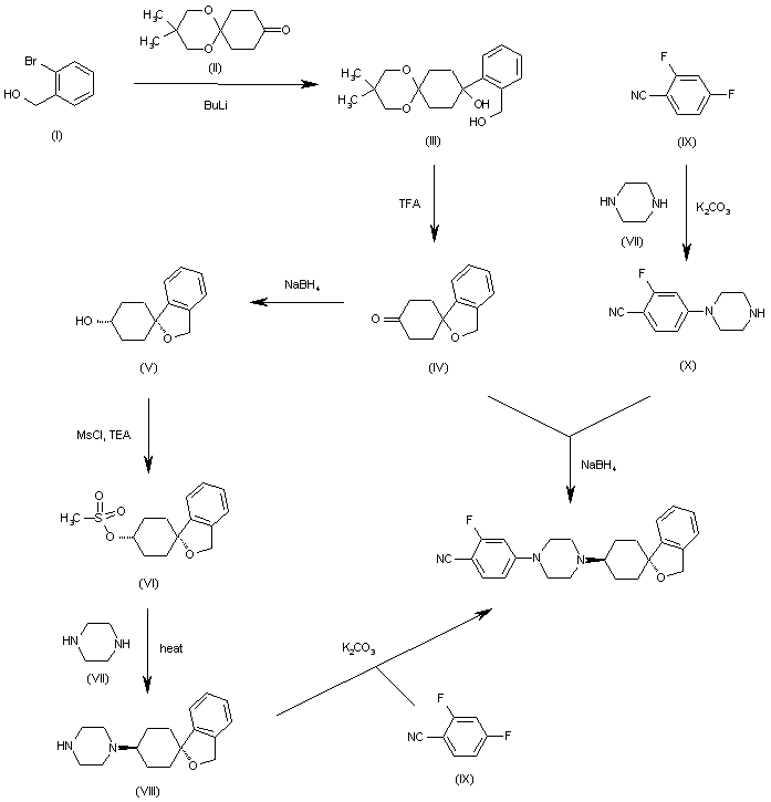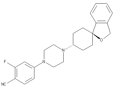 This compound has been obtained by two different ways: 1) The condensation of 2-bromobenzyl alcohol (I) with cyclohexane-1,4-dione monoethyleneketal (II) by means of BuLi in THF gives the expected adduct (III), which is cyclized and deprotected with TFA yielding the spirocyclohexanone (IV). The reduction of (IV) with NaBH4 in ethanol affords the cis-spirocyclohexanol (V), which by reaction with MsCl and TEA in dichloromethane is converted into the mesylate (VI). The condensation of (VI) with piperazine (VII) in refluxing isopropanol provides the trans-intermediate (VIII), which is finally condensed with 2,4-difluorobenzonitrile (IX) by means of K2CO3 in refluxing acetonitrile. 2) The condensation of piperazine (VII) with 2,4-difluorobenzonitrile (IX) by means of K2CO3 in acetonitrile gives 2-fluoro-4-(1-piperazinyl)benzonitrile (X), which is then reductocondensed with spirocyclohexanone (IV) by means of NaBH4 and 2-ethylhexanoic acid in CH2Cl2 to afford the target compound.