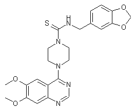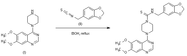 The title thiourea derivative was prepared by condensation of 6,7-dimethoxy-4-piperazinylquinazoline (I) with 1,3-benzodioxol-5-ylmethyl isothiocyanate (II) in refluxing ethanol.