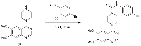 The title urea derivative was synthesized by condensation of 6,7-dimethoxy-4-piperazinylquinazoline (I) with 4-bromophenyl isocyanate (II) in refluxing ethanol.