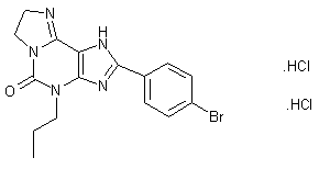 The cyclization of 5,6-diamino-1-propylpyrimidine-2,4(1H,3H)-dione (I) with 4-bromobenzoic acid (II) by means of EDC and HOBT in DMF gives 8-(4-bromophenyl)-3-propylxanthine (III), which is treated with P2S5 in refluxing pyridine to yield the 6-thioxanthine (IV). The reaction of (IV) with Me-I and NaOH in ethanol affords the methylsulfanylpurin-2-one (V), which is treated with ethanolamine (VI) in DMSO at 150 C to provide the 2-hydroxyethylamino derivative (VII). Finally, this compound is cyclized by means of SOCl2 in refluxing chloroform to provide the target imidazopurine.