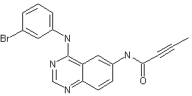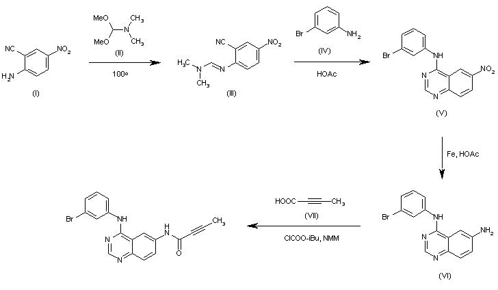 The reaction of 2-amino-5-nitrobenzoic acid (I) with N,N-dimethylformamide dimethylacetal (II) by heating at 100 C gives the formamidine (III), which is cyclized with 3-bromoaniline (IV) in refluxing acetic acid yielding 4-(3-bromophenyl)-6-nitroquinazoline (V). The reduction of (V) with Fe and acetic acid affords the amine (VI), which is finally acylated with 2-butynoic acid by means of isobutyl chloroformate and N-methylmorpholine in THF.