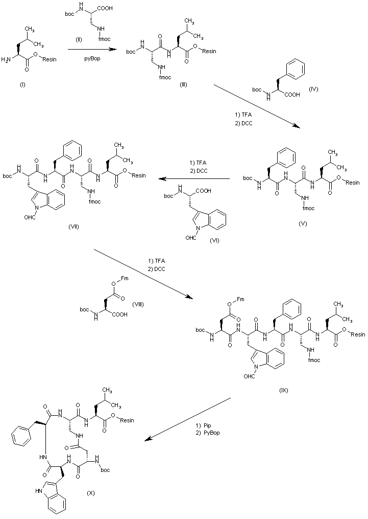The solid phase method for the synthesis of peptides is here used starting with a phenylacetamidomethyl resin coupled with boc-protected-L-leucine (I), which was coupled successively with protected L-2,3-diaminopropionic acid (II) yielding dipeptide (III), with protected L-phenylalanine (IV), yielding tripeptide (V), with protected L-tryptophan (VI) yielding tetrapeptide (VII), and with protected L-aspartic acid (VIII), yielding pentapeptide (IX). The cyclization of (IX) by selective deprotection of the side chains of diaminopropionic acid and aspartic acid with piperidine in DMF, followed by cyclization by means of PyBop and DIEA in DMF affords the cyclic pentapeptide (X).