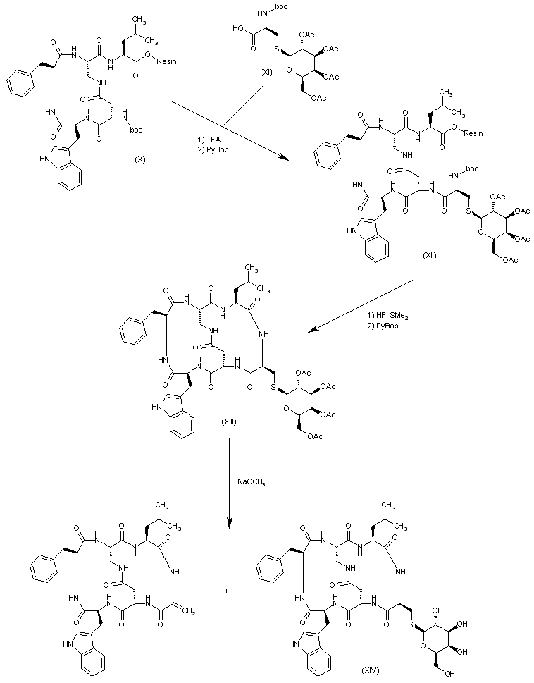 The deprotection of the Boc-amino group of the aspartic acid of (X) allows its condensation with the protected S-(tetra-O-acetyl-beta-D-galactopyranosyl)-L-cysteine (XI) affording the monocyclic hexapeptide (XII), which is treated first with HF, SMe2, p-cresol, and p-thiocresol to eliminate the solid phase resin and the Boc protecting group of the cysteine residue, and then cyclized by means of PyBop to afford the bicyclic hexapeptide (XIII). Finally, this compound is treated with sodium methoxide (c>5 mM) for more than 5 h. to give a mixture of the already known galactopyranosyl-hexapaptide Neuronorm (XIV) and the target compound (the dehydroalanyl derivative), which were separated by RP-HPLC.